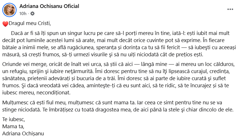 Mesajul s-a încheiat cu o declarație de iubire profundă, în care artista a subliniat că dragostea ei pentru fiu nu are margini: „Te îmbrățișez cu toată dragostea mea, de aici până la stele şi chiar dincolo de ele. Te iubesc, mama ta, Adriana Ochișanu.”